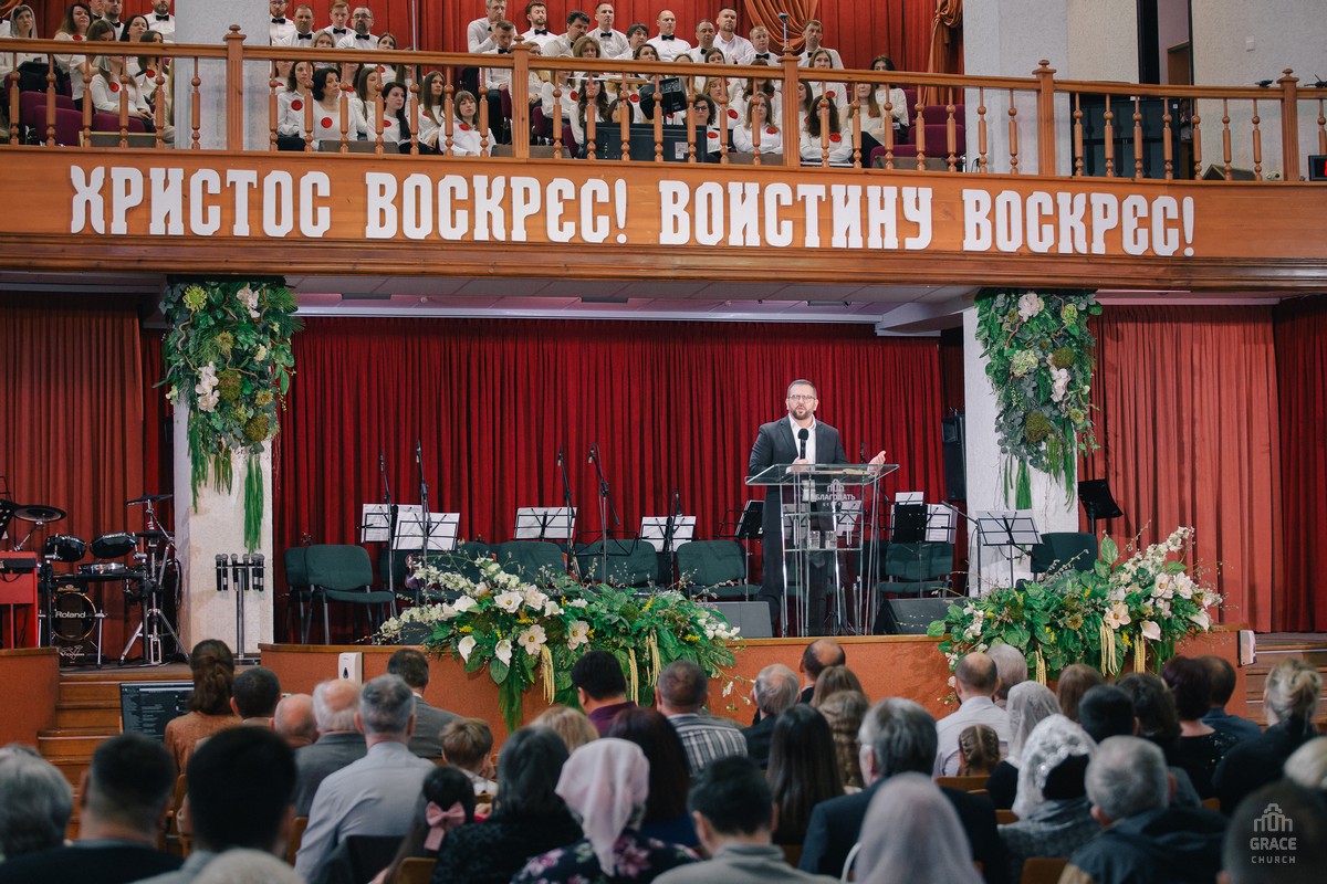 Евгений Бейня проповедовал на тему «Пасха наша – Христос». В Ветхом Завете Пасха была процессом избавления Израильского народа от Египетского рабства. В Новом Завете Пасха – это также избавление, но от рабства греха и смерти (1Кор.5:7).